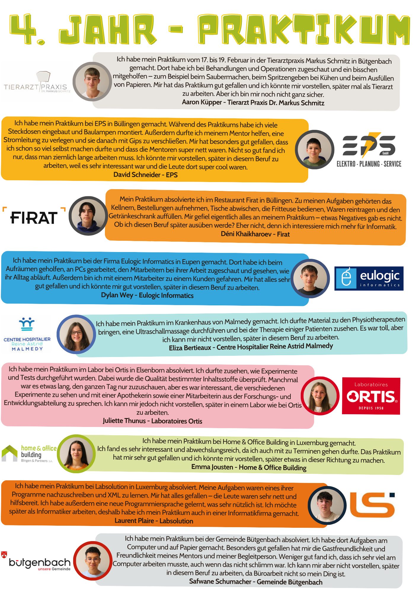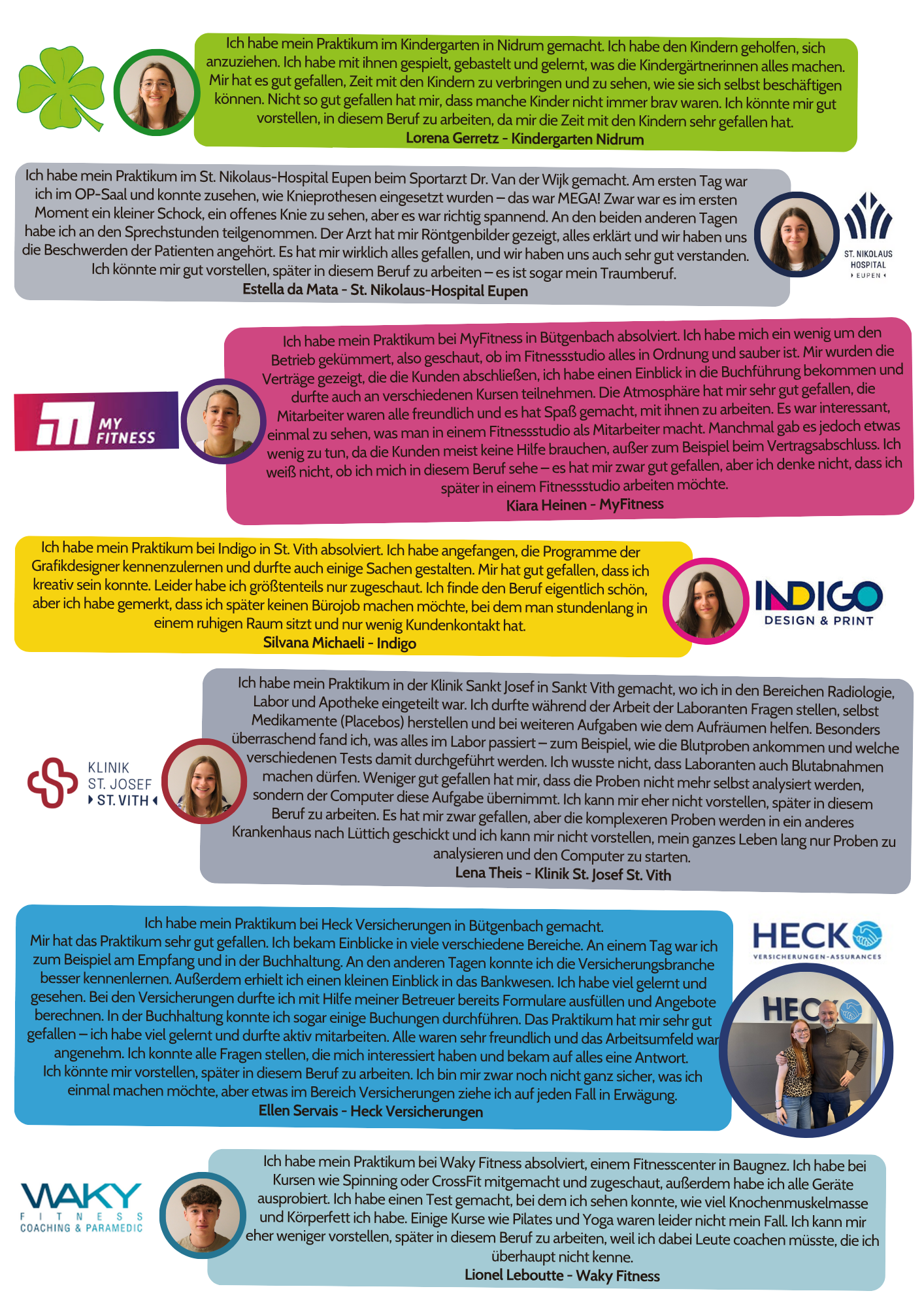 Die Schüler des vierten Jahres absolvieren ein Praktikum, um die Arbeitswelt kennenzulernen und Erfahrungen zu sammeln. Das Projekt “Berufliche Orientierung” des Ministeriums der DG zielt darauf ab, den Jugendlichen einen realistischen Einblick in verschiedene Arbeitsfelder zu ermöglichen, um sie bei ihrer zukünftigen Studien- und Berufswahl zu unterstützen. Während des 3-tägigen Praktikums bewerben sich die Schüler eigenständig bei Unternehmen ihres gewünschten Sektors mit einem Lebenslauf und einem Bewerbungsschreiben. Sie haben die Gelegenheit, Beobachtungen anzustellen, Erklärungen zu folgen und kleinere Aufgaben selbstständig oder begleitet auszuführen.